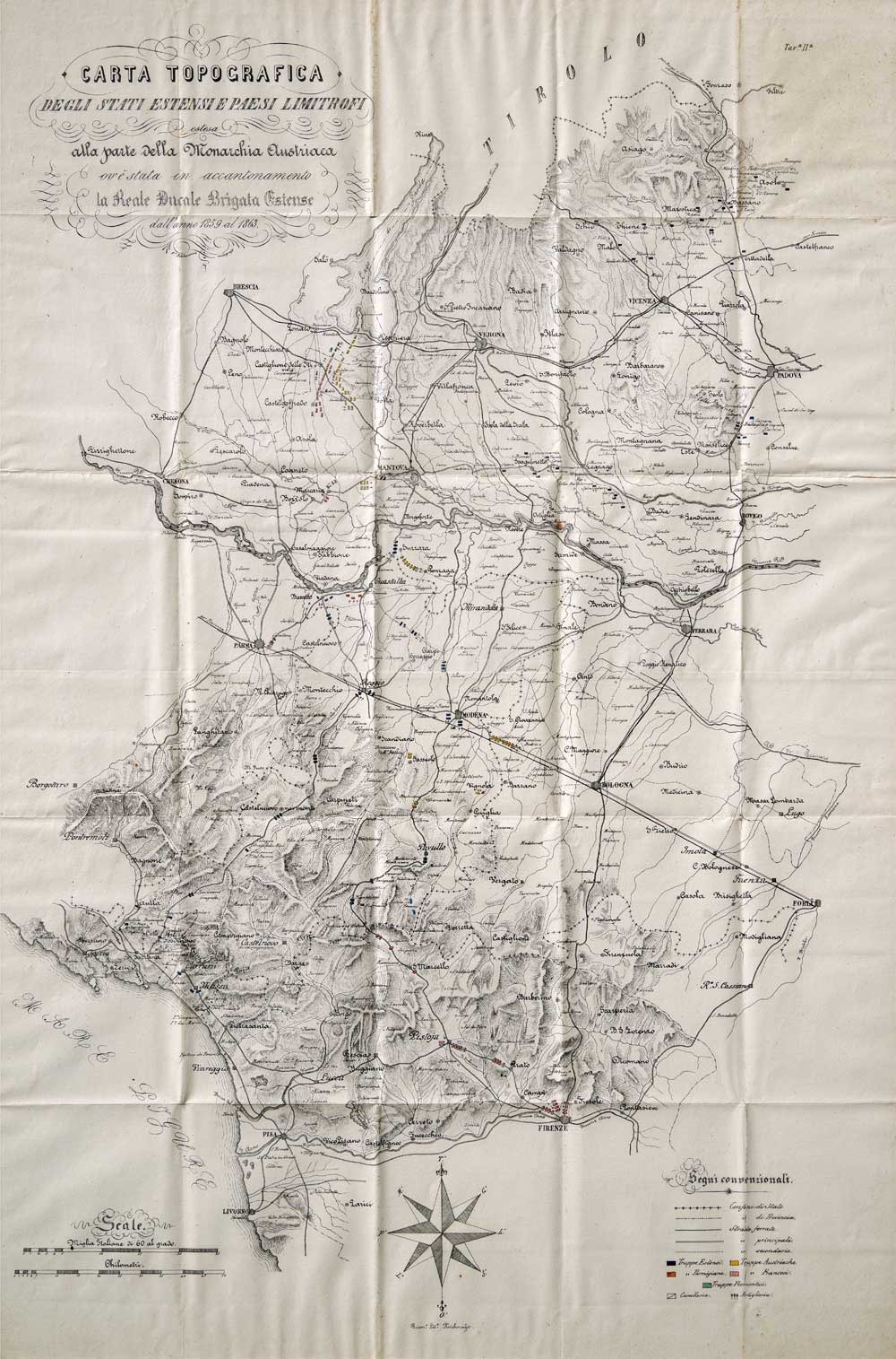 Cartografo: sconosciuto, incisore: V. Bolobanovich, editore: Tipografia Emiliana, Venezia. Con questa carta (mm 820 x 560) si può considerare chiusa un’epoca: è l’ultima volta che viene rappresentato il Ducato Estense, dopo più di 500 anni l’ultimo Este lascia il Ducato di Modena che, persa l’autonomia, diverrà parte integrante del Regno Sabaudo grazie ad un referendum plebiscitario (piuttosto criticato da una parte degli storici). Francesco V l’11 Giugno 1859 non si allontanò dal proprio territorio da solo, ma accompagnato dai fedeli dell’esercito estense (la Brigata Estense) che, invece di disperdersi e rientrare alle proprie famiglie, seguirono il Duca nel suo esilio. Il piccolo esercito, formato da circa 4.000 uomini, rimase tre anni a Cartigliano Veneto nell’attesa che qualche rivolgimento permettesse ancora una volta il ritorno, ma alla fine si sciolse e molti militari, seppur dapprima minacciati di perdita dei propri beni in patria e poi lusingati dai piemontesi per un rientro, seguirono Francesco V a Vienna o si arruolarono nell’esercito austriaco od in quello pontificio. Preme far notare che quello della Brigata Estense fu l’unico esempio nell’Italia preunitaria e, forse, in Europa, in cui un contingente militare accompagnò il sovrano in esilio anche dopo la cessazione del suo regno. La carta è a corredo del volume Giornale della R. Ducale Brigata Estense dal 1 Gennaio 1859 al 24 settembre 1863, commovente diario di un’epopea triste a margine della Storia, nel complesso è accurata e precisa, ma, incomprensibilmente, mostra ancora i confini pre 1848. Bibliografia: Davoli Z., Sanfelici R., 2005, scheda n. 123.