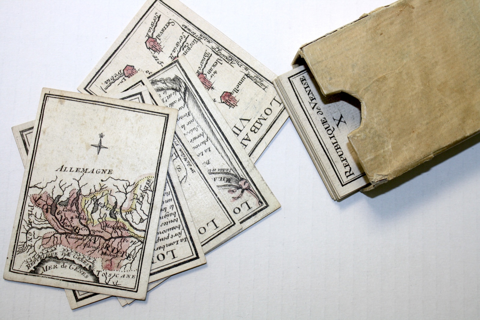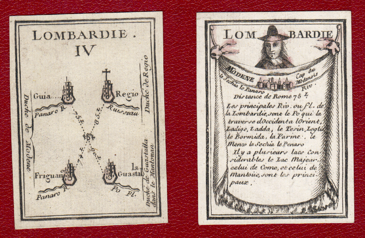 Rarissime carte da gioco (ognuna mm 60 x 80) relative alla Lombardia che mostrano essenziali note geografiche (fiumi, laghi e distanza in miglia da Roma) sulle città di Modena, Reggio, Mirandola, Carpi, Sassuolo, Guiglia e del Frignano. Pubblicate a Parigi nel 1763 da Nicholas de Poilly, sono un bell’esempio di gioco didattico, anche se le informazioni non sempre sono precise (per esempio Mirandola, al tempo non più signoria autonoma, ma da circa 50 anni inserita nei possedimenti del Duca di Modena viene erroneamente inserita nel Ducato di Mantova). Carte presumibilmente provenienti dalla stessa opera sono conservate presso il British Museum e descritte in un testo inglese inerente le “miniature maps”. Bibliografia: British Museum reg. n. 1906,0723.36.1-51; Geoffrey L.King, 1996, in Miniature Antique Maps, p. 158 descrive il mazzo, ma ne ignora l’autore.