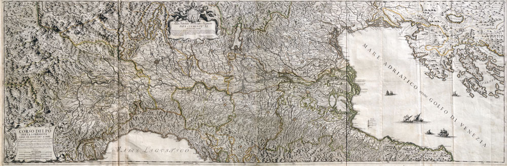 Cartografo: A. Cerruti, editore D. de Rossi, Luogo: Roma. Sontuosa carta (mm 580 x 1745) in 4 fogli che inaugura il filone cartografico dei Corso del Po che tanto successo avrà nell’ambito cartografico per circa cento anni. Grandioso rilievo da parte di un militare (neppure originario dei luoghi essendo ufficiale dell’esercito papalino), che evidenzia una notevole attenzione al disegno delle montagne, dei fiumi e delle strade più che alla realtà politica. Come afferma il prof. Z. Davoli la carta è grandiosa e di notevole interesse... e ci dice come fossero importanti i grandi fiumi per i commerci e in generale per le comunicazioni tra i popoli, al punto che essi in antico non facevano da confine naturale tra realtà umane contrapposte, ma attorno a essi si creavano comunità unitarie..., asserzione quanto mai condivisibile e rispecchiabile negli assetti politici delle nostre zone amministrate dai Gonzaga e dagli Este. La carta è inserita nell’atlante Mercurio geografico edito a Roma da de Rossi sotto la direzione tecnica e scientifica di J. Cantelli di Vignola. Dei quattro fogli di cui è costituita l’opera i primi tre rappresentano la tradizionale parte del nord Italia, il quarto, probabilmente aggiunto posteriormente, l’Istria e l’Adriatico. Nell’angolo inferiore sinistro della prima lastra è presente il titolo, in alto al centro del secondo foglio vi è un secondo cartiglio con la dedica al Pontefice. Bibliografia: Davoli Z., Sanfelici R., Zanasi S., 2003, scheda n. 84.