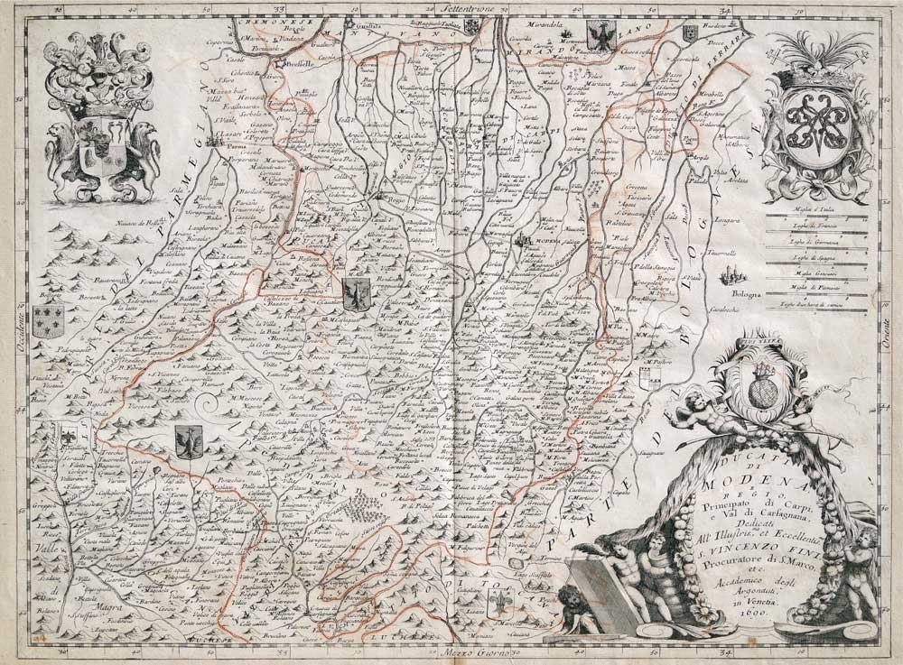 Carta (mm 635 x 457) pubblicata da Antonio Zatta a Venezia. Francesco Maria d’Este, vescovo di Reggio Emilia e abate di Nonantola, commissionò a Girolamo Tiraboschi la stesura della storia dell’abbazia di Nonantola e a corredo di tale sontuosa opera fece eseguire anche questa carta. Essa è disegnata su quella del Vandelli ed è opera di un tecnico locale, il mirandolese Giovanni Costa, geometra e ufficiale estense. Nelle lettere del Tiraboschi il Costa viene menzionato prima come capitano e poi come maggiore. Questo fa presumere che già all’epoca, all’interno dell’esercito estense, fosse presente un certo interesse per la cartografia che sfocerà poi, durante la Restaurazione, nell’opera tecnicamente avanzatissima del Genio topografico estense. La carta è disegnata con grande impegno ed eleganza tanto che, pur di inserirla nell’opera, fu tenuta ferma la diffusione fino al suo definitivo compimento presso lo Zatta di Venezia, sicuramente il miglior editore cartografico d’Italia del periodo. In effetti probabilmente una buona parte del bel risultato è proprio dovuta all’esperto editore che ha diretto e organizzato l’opera degli incisori Pitteri e Zuliani per più di un anno prima di consegnare i fogli incisi ai Nonantolani. Non si sa quante copie siano state tirate, sicuramente la carta poteva essere richiesta indipendentemente dai volumi della storia dell’abbazia, per cui sono state prodotte diverse copie sciolte, riconoscibili per la mancanza delle pieghe presenti negli esemplari inseriti a corredo dell’opera e, ovviamente, ora piuttosto rare. Complessivamente l’incisione si presenta elegante e accurata. Alcune carte sono state anche acquarellate e si presentano di forte impatto scenografico, anche se forse perdono un po’ di interesse collezionistico. Questo esemplare è tra queste opere con coloritura coeva. Bibliografia: Davoli Z., Sanfelici R., Zanasi S., 2003, scheda n. 140.