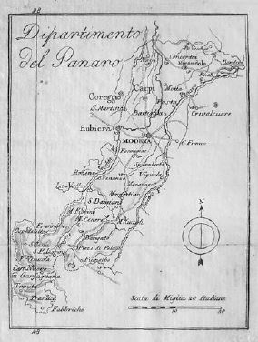 La carta è piccola (mm 70 x 122) e molto sommaria, ma la sua grande rarità la rende di notevole interesse collezionistico. Proviene sicuramente da un piccolo volume non conosciuto. Ben orientata con il nord in alto, evidenzia toponimi inconsueti, molto probabilmente stazioni di posta. È probabilmente la prima rappresentazione del nuovo assetto territoriale modenese (Dipartimento del Panaro) all’interno della suddivisione per dipartimenti della Repubblica Italiana.