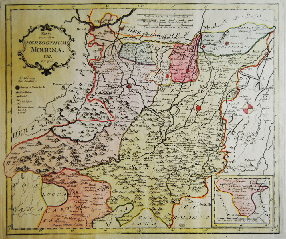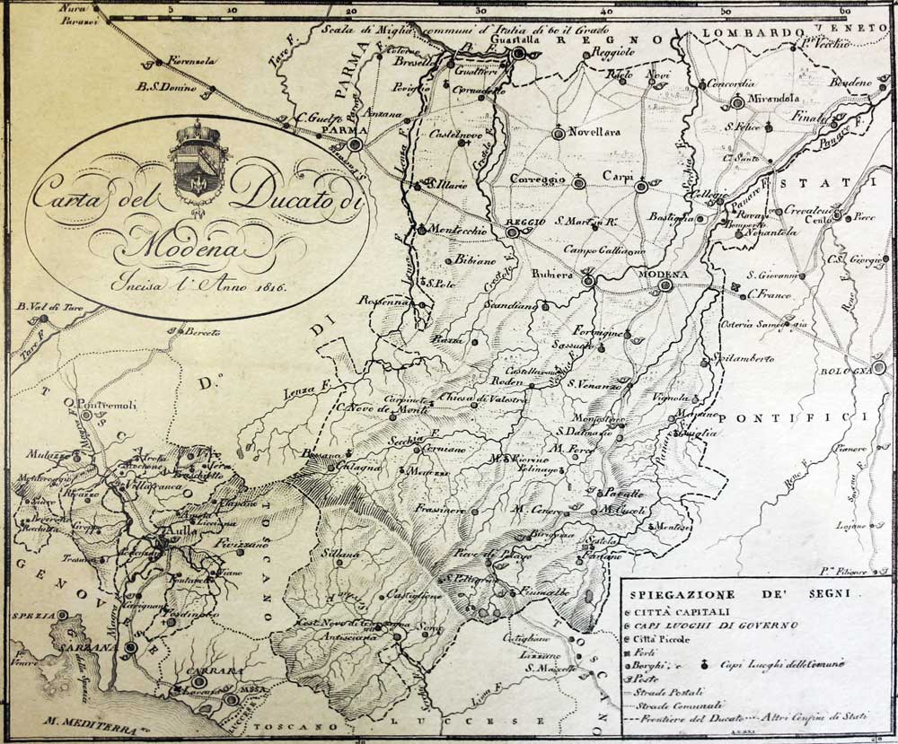 Pubblicata a Modena, la mappa (mm 118 x 132) è inserita in un raro opuscolo turistico dove sono evidenziate le vedute principali della città di Modena nonché questa, piccola, ma ben fatta carta del ducato. A causa delle ridotte dimensioni non eccelle nella toponomastica e nell’orografia, ma è sicuramente pregevole per la precisione dei confini meridionali dove Massa e Carrara, feudi dei Cibo-Malaspina, sono indicate come indipendenti, poiché giuridicamente erano ancora governate dalla madre del Duca, Maria Beatrice e furono annesse formalmente a Modena nel 1829 alla morte di questa. Sono altresì correttamente compresi nei domini estensi alcuni territori della Lunigiana che la duchessa Maria Beatrice, rientratane in possesso col Congresso di Vienna, aveva deciso di assegnare subito al figlio. La carta ha subito un secondo stato di pubblicazione, sempre ad opera della tipografia Vincenzi, dove è sparita la dizione Incisa l’Anno 1816, mentre si evidenzia la strada ferrata, menzionata anche nella legenda. Ovviamente l’interesse collezionistico è consistente per la rarità e perché è un prodotto totalmente locale. Bibliografia: Davoli Z., 2011, scheda n. 112.