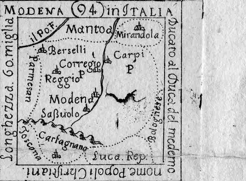 Incisione in rame (mm 50 x 40). Rara tessera di un gioco dell’oca che evidenzia essenziali note geografiche a fini didattici. L’opera pubblicata a Venezia nel 1680 probabilmente era nata come gioco esclusivo ideato da padre Casimiro Freschot per i rampolli di una nobile famiglia veneziana e in seguito pubblicata a stampa da Giovanni Parè, libraro alla Fortuna. La cartina, anche se assai semplificata, è molto chiara e riporta gli elementi essenziali per la conoscenza della composizione e collocazione dei territori soggetti al Duca di Modena e di Mirandola allora Ducato autonomo, feudo dei Pico. Bibliografia: Solinus 2007, p.76.