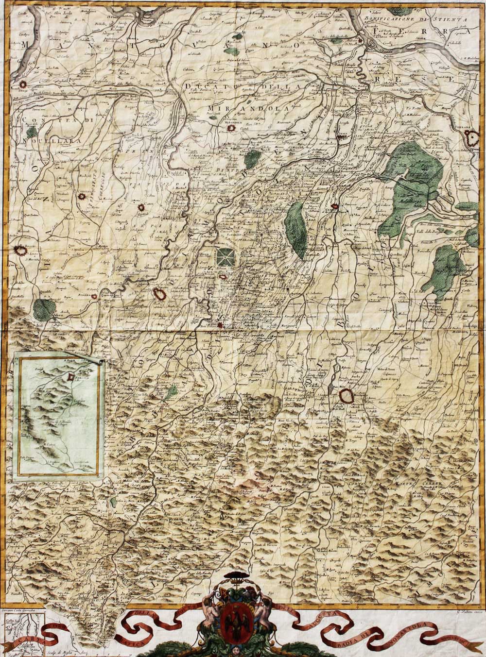 La carta (mm 400 x 250), attualmente non reperita in bibliografia, evidenzia il territorio a confine tra il Ducato di Modena, il Bolognese e il Ferrarese, teatro di aspre azioni belliche negli anni 40 del XVII secolo. È stata sicuramente approntata a corredo di un testo che tratta della cosìdetta “Guerra di Castro” furiosamente combattuta anche nelle nostre zone essendo il Duca modenese Francesco I alleato dei Farnese. Oltre alla rappresentazione del territorio la carta è impreziosita dal titolo racchiuso all’interno di un cartiglio a nastro posto in alto al centro e da un cartiglio a sinistra con dedica al cardinal Barberini, in basso a sinistra è ben evidente anche la firma e la data: Batista Cavazza, Agosto 1643; una datazione così precisa non può che essere un chiaro riferimento ad avvenimenti legati a situazioni temporalmente ben definite che reputo siano relative alla rotta delle armate papaline di fine Luglio 1643(x) quando, nei pressi di Nonantola, le truppe modenesi, comandate dal celebre Raimondo Montecuccoli, riportarono una sonora vittoria sull’esercito dei Barberini che fu costretto ad asserragliarsi nel Forte di Castelfranco permettendo così alle armate avversarie di dilagare nella pianura bolognese (le presenti invasioni del titolo). La dedica a un personaggio di casa Barberini e il titolo (...presenti invasioni) fan decisamente supporre che l’opera sia di parte papalina e quindi prodotta a Bologna dallo sconosciuto Batista Cavazza, reporter di guerra ante literam. A Modena si menò gran vanto di questa vittoria e, sempre nell’agosto 1643, fu edita una raffinata stampa illustrativa dei fatti d’arme a opera di un tal Cimador da Carpi.