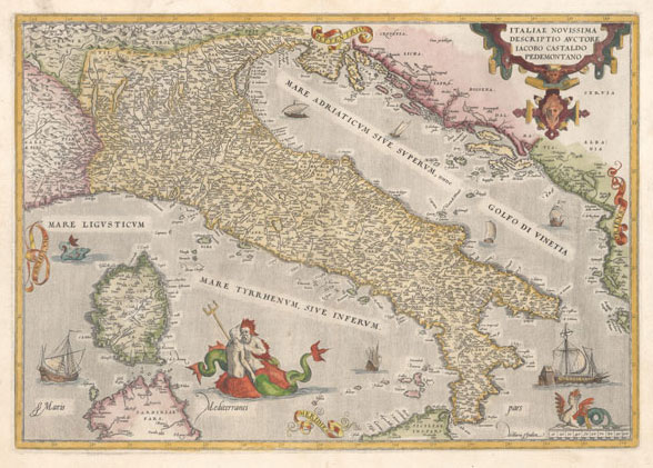 Abramo Ortelio, olandese di Anversa, ebbe la geniale intuizione di raccogliere le migliori carte geografiche allora disponibili e di riunirle in una raccolta che chiamò “Theatrum orbis terrarum”, opera che ottenne un grandioso successo con più di 40 edizioni. Questa prima edizione si differenzia dalle successive perché le due figure allegoriche del tritone e della sirena situate al centro del mar Tirreno sembrano colte in un “procace” atteggiamento, sicuramente considerato all’epoca poco consono ai principi di austerità sanciti dalla Controriforma. A causa della censura nelle successive edizioni le due figure appaiono affiancate, “in posa meno ardimentosa”. Questa prima edizione è poco comune sul mercato in quanto sembra siano state stampate solo 325 copie. Bibliografia: Valerio V. 2011, scheda 10, p. 40; Borri R., 2010, p. 71.