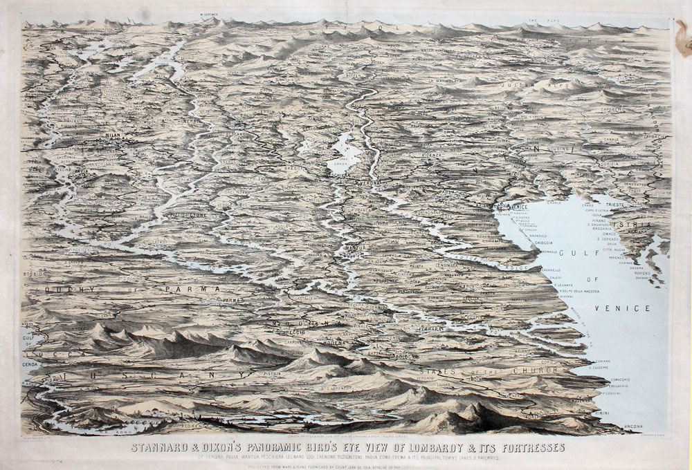 Pubblicata a Londra, questa suggestiva cromolitografia (mm 720 x 510) a volo d’uccello raffigura il territorio interessato dalla Seconda guerra d’indipendenza. Sono rappresentate le città con vedute in miniatura di palazzi, ponti e monumenti, le infrastrutture (strade ferrate) e l’oro-idrografia in una visione d’insieme di grande effetto grazie anche alla recente tecnica della cromolitografia. L’interesse per i fatti d’arme è ben evidenziato da questa (e da molte altre) opere che tendono a soddisfare le richieste dell’opinione pubblica estera attraverso raffigurazioni e riprese di grande impatto. Nel nostro caso si legge sulla mappa che è stata redatta grazie a carte e mappe fornite all’editore londinese dall’addetto d’ambasciata sardo, conte J. De Foix.