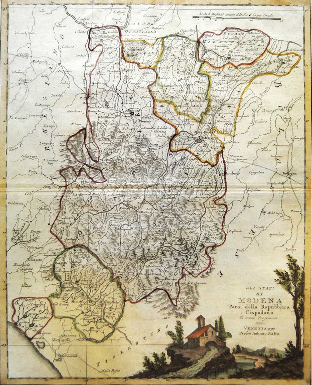 Nel 1796 inizia l’epopea napoleonica con le rapide vittorie sui Piemontesi e sugli Austriaci e questi fatti cominciarono ad alterare velocemente la situazione politica. Il 26 agosto il Senato reggiano dichiarò decaduto il duca Ercole III d’Este e proclamò la Repubblica Reggiana alla quale si unirono Modena, Bologna, Ferrara e la Romagna creando la Repubblica Cispadana, dal cui vessillo deriva la bandiera italiana. Ovviamente gli editori, visto il grande clamore e l’interesse pubblico per gli avvenimenti, si sforzarono di seguire gli avvenimenti sollecitando i cartografi a recepire le innovazioni politiche. La cosa non era però così semplice, sia per la rapidità dei mutamenti, sia perché questi potevano rivelarsi effimeri e non riconosciuti a livello internazionale. Con questa carta (mm 400 x 305) vediamo come il principale editore di carte geografiche del periodo, il veneziano Zatta, per essere tempestivo non trovò di meglio che ristampare le carte che aveva in produzione (pubblicata nel 1783) aggiungendo semplicemente nel cartiglio la notizia del mutamento politico. La carta è comunque molto interessante dal punto di vista collezionistico essendo l’unico esempio della rappresentazione dei nostri territori durante il breve periodo Cispadano (gennaio 1797 - giugno 1797). In Collezione Cintori anche un volume intitolato "Prospetto degli affari attuali dell’Europa ossia Storia della guerra presente con aneddoti ed illustrazioni analoghe..." edito dallo Zatta a Lugano nel 1797, dove è inserita la carta del modenese a corredo del testo, in carta sottile e ripiegata. Bibliografia: Davoli Z., 2011, scheda n. 78.