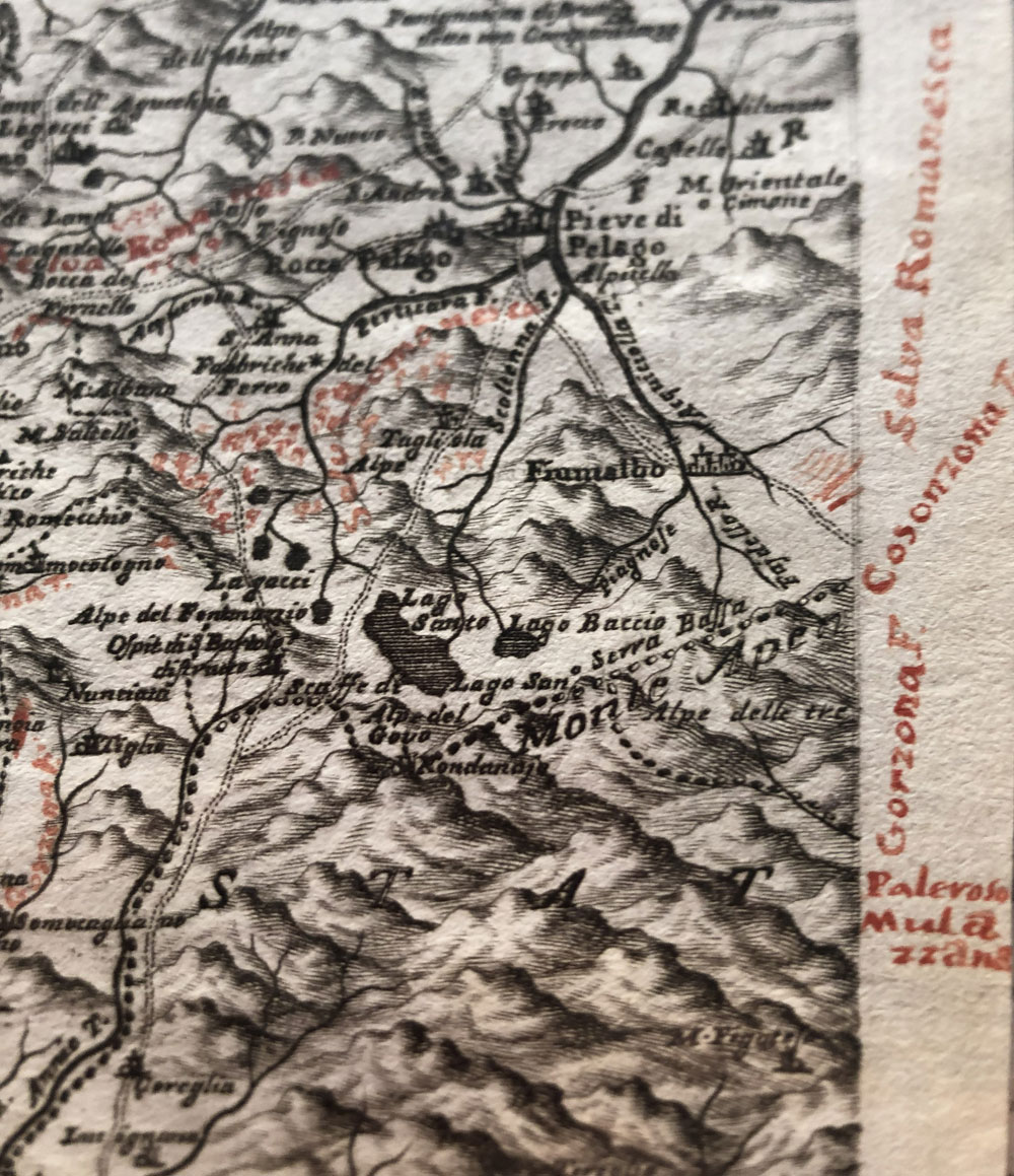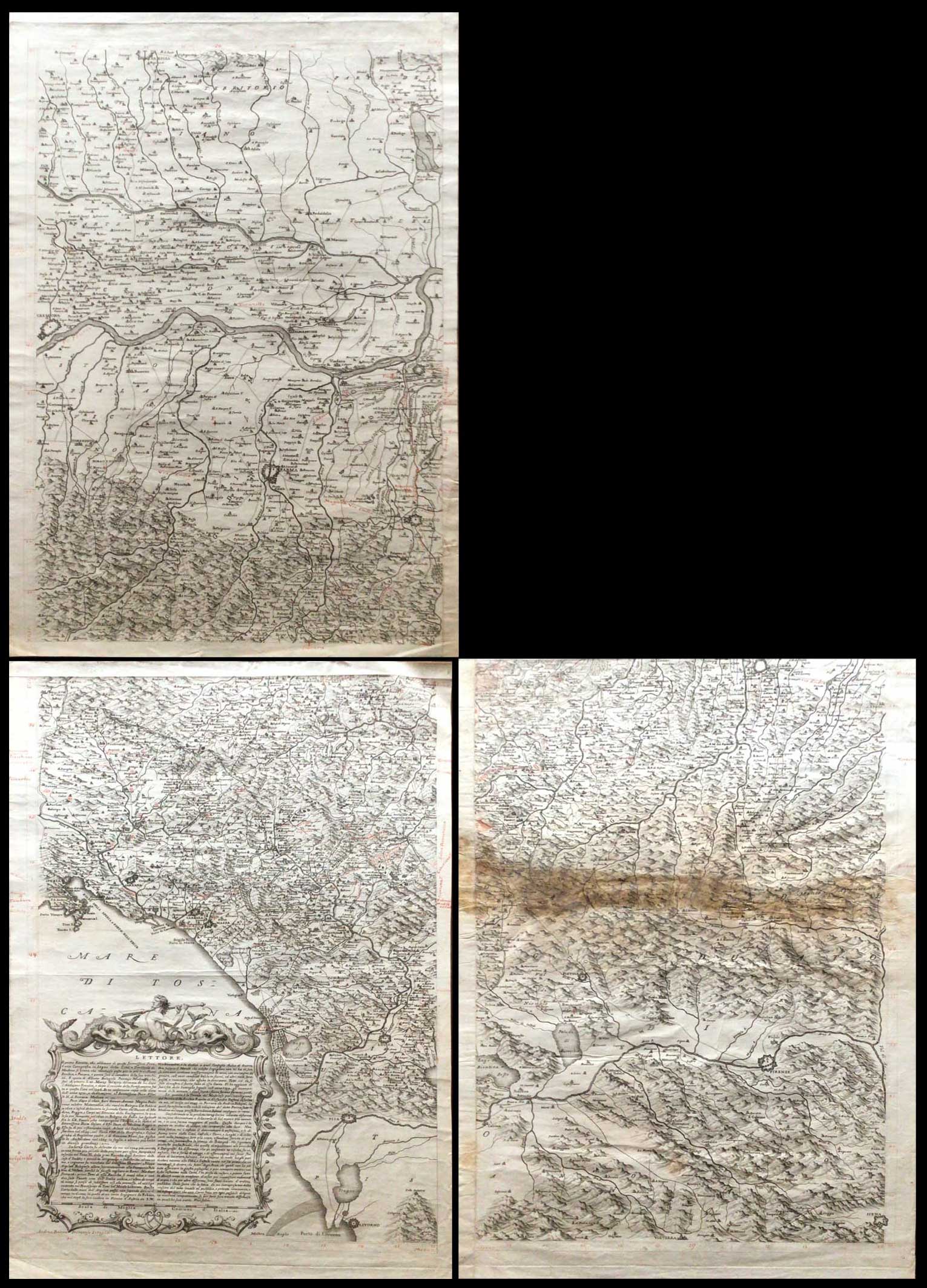 In Collezione un rarissimo esemplare della carta del Vandelli che riporta note manoscritte. Così testimonia Piercarlo Cintori: "(...) di questo sontuoso lavoro sono pervenuto in possesso della bozza (presumibilmente) finale con le correzioni a penna rossa del Vandelli stesso. Purtroppo l’opera è deficitaria del primo riquadro (quello più rappresentativo delle zone modenesi), ma rappresenta un importantissimo documento storico e testimonia il rapporto intenso che legava il cartografo e l’incisore (il noto Bolzoni)" ("Disegno del territorio del ducato estense attraverso la cartografia storica", p. 27).