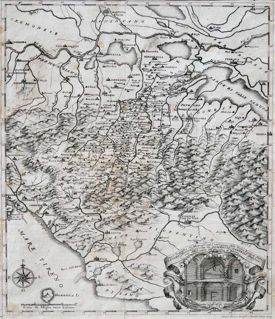 Incisione in rame (mm 1.060 x 690) a cura di Andrea Bolzoni in 4 fogli, che spesso sono ritagliati e incollati su tela. In alto, entro un ricco cartiglio, si trovano l’indicazione del titolo della tavola e una piacevole veduta di Modena. Nel margine inferiore sinistro altro cartiglio con spiegazione al “LETTORE...”. Strepitosa carta a cura di Domenico Vandelli, matematico, naturalista e cartografo, nato a Levizzano Rangone (MO), da una famiglia di studiosi. Fu versato nella matematica, nella geografia e nelle scienze naturali, ma coltivò anche le lettere e l’archeologia. Nel 1725 intraprese un viaggio nei principali centri culturali dell’Europa e al suo ritorno fu chiamato dal duca Rinaldo a ricoprire la cattedra di matematica presso l’Università di Modena. Il duca Francesco d’Este lo nominò suo cartografo e, in seguito all’unificazione del Ducato di Modena con Massa e Carrara, gli commissionò il progetto per la costruzione di una strada attraverso le Apuane, da Massa a Castelnuovo Garfagnana. Dopo dieci anni di lavoro fu costruita la strada, detta Via Vandelli, che attraversava l’Appennino e poi le Alpi Apuane, salendo fino a 1634 m del passo della Tambura; la “Via Vandelli” non fu, però, molto utilizzata per le difficoltà del percorso, rese ancora peggiori nel periodo invernale. Domenico Vandelli era conosciuto inoltre per la sua opera cartografica: tra i suoi lavori più importanti, la Tavola Geografica del Modanese... e la presente carta degli Stati del Serenissimo Signor Duca di Modena... edita come foglio volante e considerata la migliore rappresentazione dei nostri territori e una delle più intriganti dal punto di vista storico grazie al bagaglio di note d’autore, plagi e ipotesi sulla elaborazione che l’accompagnano. Infatti potrebbe esser stata copiata, almeno in parte, da un lavoro inedito di J. Cantelli; in ogni modo rimane probabilmente la carta di maggior impatto scenografico relativa i territori estensi. Bibliografia: R. Almagià, 1922 p. 138, L. Federzoni in Pellegrini e Pozzi, 1989 pp. 7-16; L. Federzoni, 2001 p. 463; Davoli Z., Sanfelici R., Zanasi S., 2003, scheda n. 132.